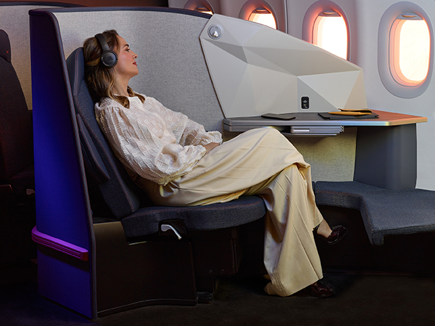 Spacious comfort: The seat converts into a large, full-flat bed for exceptional comfort. A spacious ottoman with generous knee room, combined with an expansive double-window view, ensures a supremely relaxing flight.